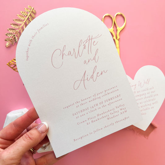 Charlotte arch shaped wedding or event invitation with heart shaped additional card