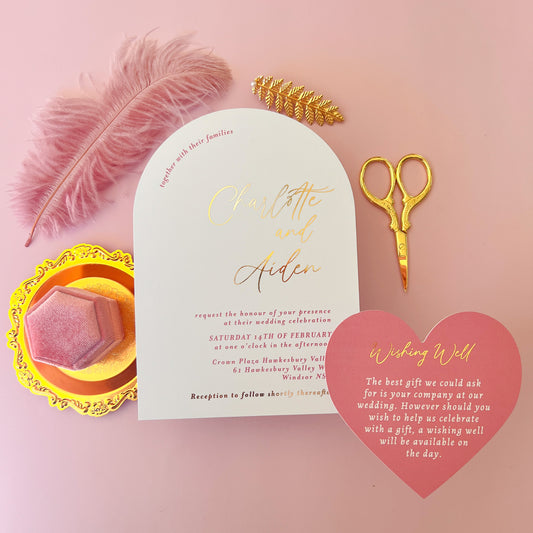 Charlotte Gold Foil arch shaped wedding or event invitation with heart shaped dusty pink additional card