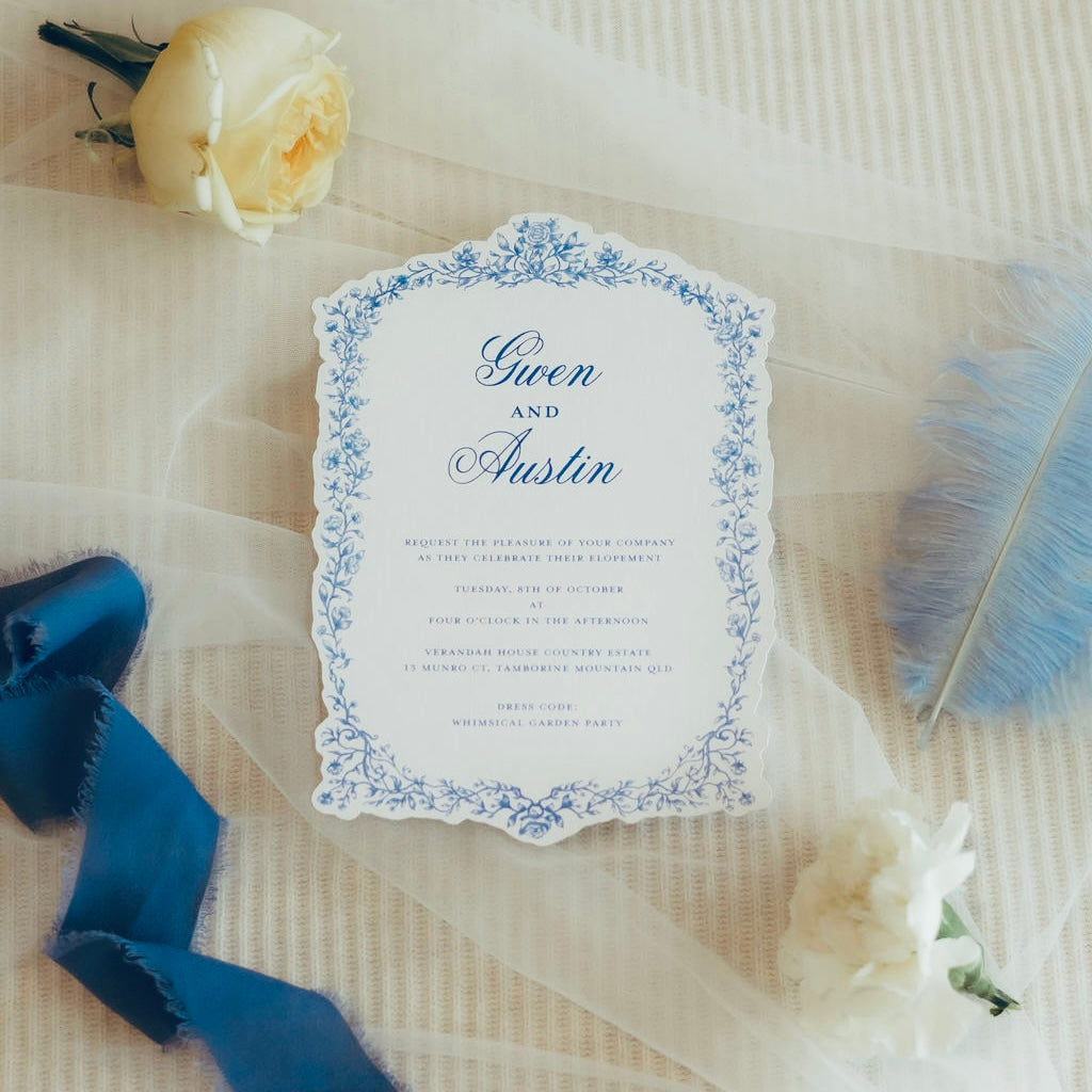 This beautiful Bridgerton inspired invitation set is printed on your choice of white card.
